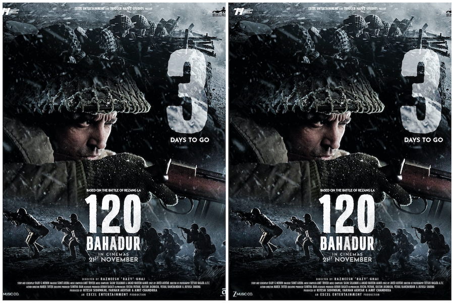 सोशल मीडिया पर फरहान अख्तर ने 18 नवंबर 1962 को रेजांग ला की पौराणिक लड़ाई के 63 साल पूरे होने पर फिल्म 120 बहादुर का नया पोस्टर जारी किया। पोस्टर में फरहान पूरी सैन्य पोशाक में बर्फीले युद्धक्षेत्र में दिखाई दे रहे हैं, जो उस साहस और दृढ़ता को याद दिलाता है जिसे मेजरशैतान सिंह के नेतृत्व में 13 कुमाऊँ रेजिमेंट के 120 भारतीय सैनिकों ने 3,000 चीनी सैनिकों के खिलाफ दिखाया था। फरहान ने कैप्शन में उसअद्वितीय बहादुरी को याद करते हुए भावुक कर दिया।